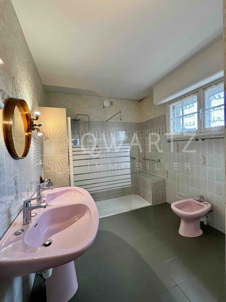 Entrée en RDC avec vestiaire, wc indépendant, grande cuisine indépendante de plus de 22 m2, avec arrière-cuisine et accès à la cave en sous-sol, grand salon-séjour de 56 m2 environ avec cheminée, superbes vues mer et accès à très jolie terrasse orientée ouest à portée de la plage, hauteur sous plafond de 2,60 m, espace bureau, suite parentale avec chambre, salle d'eau et wc.